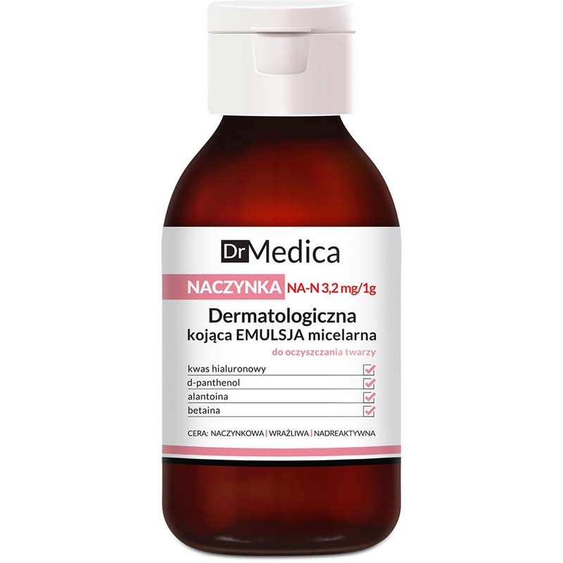 Codzienną czynność zmywania makijażu warto połączyć z czymś, co wypielęgnuje Twoją skórę twarzy. Taką możliwość stwarza dermatologiczna kojąca emulsja micelarna Dr Medica. Preparat zawiera formułę NA-N 3,2 mg/1g, która składa się z silnych substancji aktywnych odpowiadających za oczyszczenie skóry, jej pielęgnację i zmywanie makijażu. Środek nie wysusza cery, nawilża ją i łagodzi powstałe podrażnienia, dając efekt wygładzenia i ukojenia. Emulsja redukuje widoczność żyłek i pajączków na twarzy, niweluje zaczerwienienia i przebarwienia.