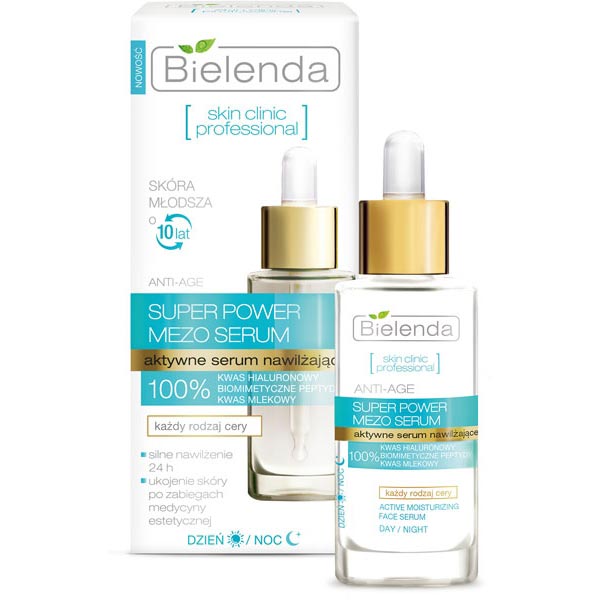 Skin Clinic Professional - linia profesjonalnych preparatów anti-age do pielęgnacji twarzy. Super Power Mezzo Serum to aktywne serum nawilżające na noc i na dzień polecane do każdego rodzaju cery. Serum poprawia nawilżenie, jędrność i elastyczność skóry, zapobiega powstawaniu i redukuje istniejące zmarszczki, wygładza, zmniejsza zaczerwienienia.