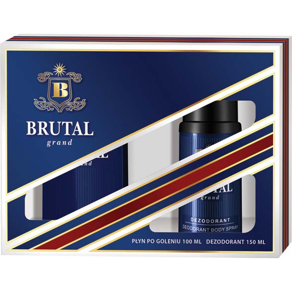 Zestaw kosmetyczny, w którego skład wchodzą: płyn po goleniu 100ml oraz dezodorant w sprayu 150ml. Produkty z linii zapachowej Grand.