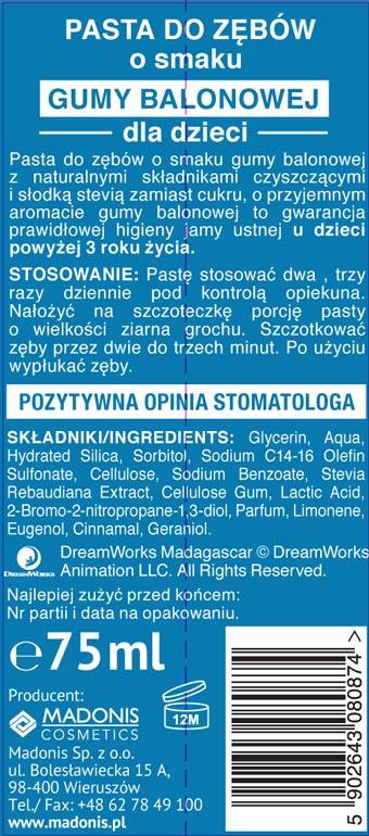 Poza delikatnością i zarazem skutecznym działaniem, produkt zachwyca również barwną tubką, przedstawiającą kolorowe postaci z animowanego filmu Madagaskar, który skradł serca wielu dzieci.