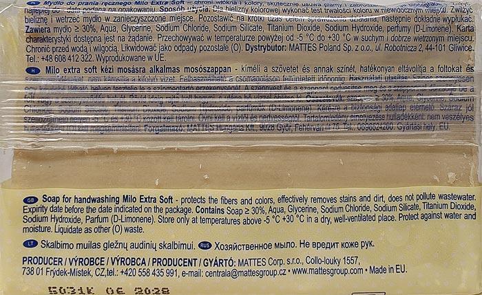 Szczegółowy opis szarego mydła perfumowanego Milo Extra Soft, marki Mattes